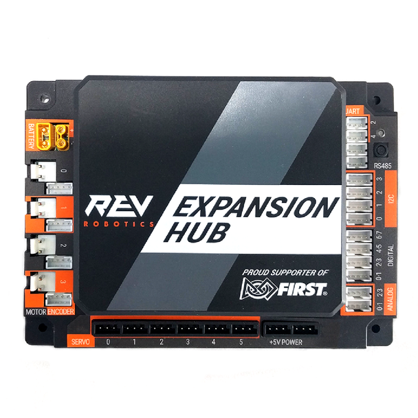 V Robotics 扩展枢纽是一个低成本的教育设备,可以与任何计算机(通常是 REV Robotics 控制枢纽 或安卓手机)通信,以提供构建机器人和其他机电一体化系统所需的接口。扩展枢纽专为 withstand教室和比赛场地的严苛环境而设计。它具有成熟的固件,适用于基本和高级使用案例,并且未来可以现场升级。